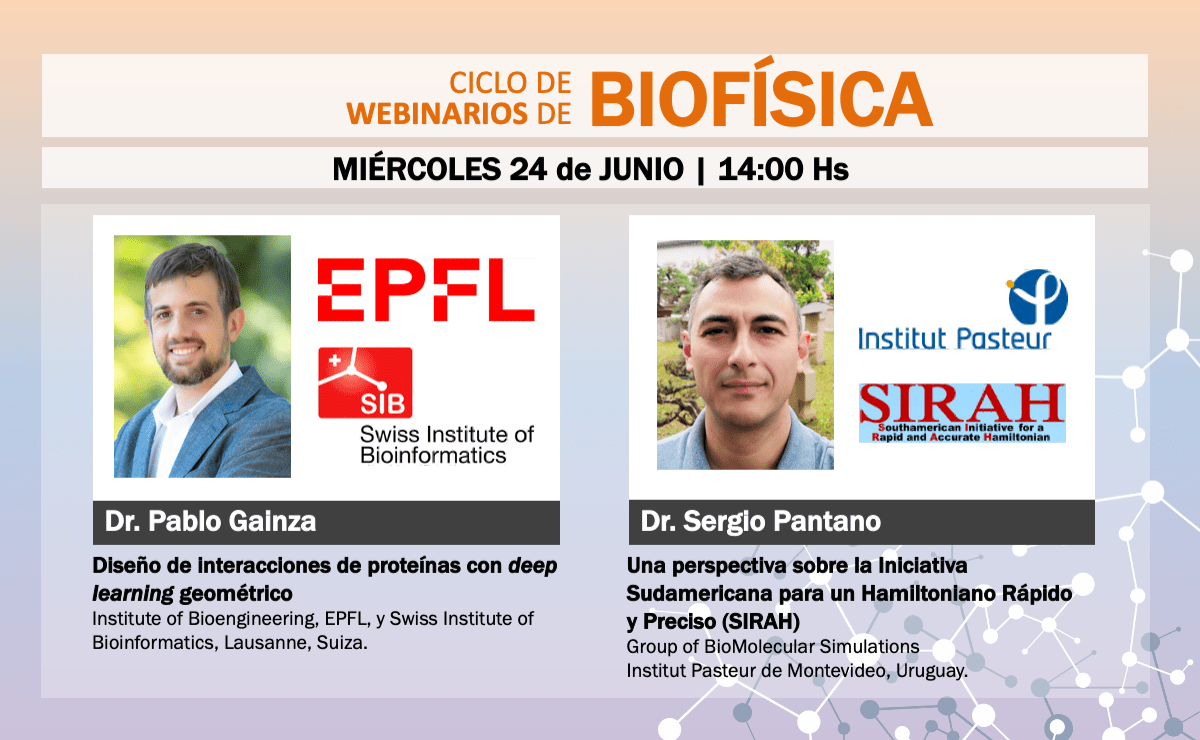 Este es el tercer seminario del Ciclo de Webinarios de Biofísica en español, moderados por el Dr. Luciano Abriata, École Polytechnique Fédérale de Lausanne (EPFL), Suiza. En esta oportunidad, los investigadores invitados son el Dr. Pablo Gainza, EPFL, Suiza; y el Dr. Sergio Pantano, Institut Pasteur de Montvideo, Uruguay. El seminario estará accesible por YouTube el 24-JUN-2020 desde las 2 pm (Argentina).
