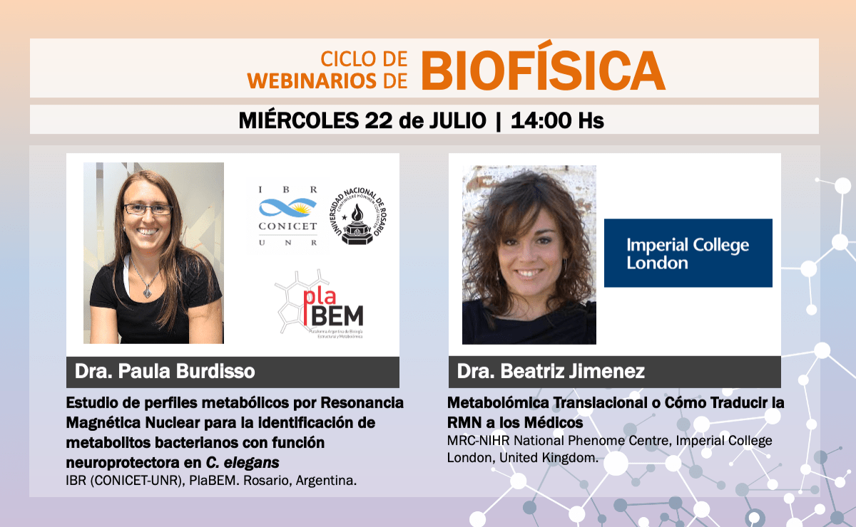 Este es el quinto seminario del Ciclo de Webinarios de Biofísica en español, moderados por el Dr. Luciano Abriata, École Polytechnique Fédérale de Lausanne (EPFL), Suiza. En esta oportunidad, las investigadoras invitadas son la Dra. Paula Burdisso, del Instituto de Biología Molecular y Celular de Rosario, IBR (CONICET-UNR), y la Plataforma Argentina de Biología Estructural y Metabolómica (PlaBEM); y la Dra. Beatriz Jimenez, NMR Divisional Manager, MRC-NIHR National Phenome Centre, Imperial Clinical Phenotyping Centre, Division of Systems Medicine, Department of Metabolism, Digestion and Reproduction, Imperial College London. El seminario estará accesible por YouTube el 22-JUL-2020 desde las 2 pm (Argentina).