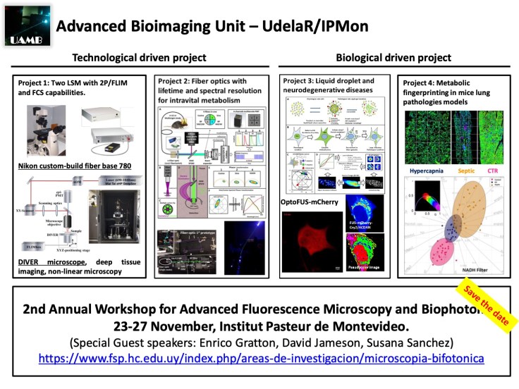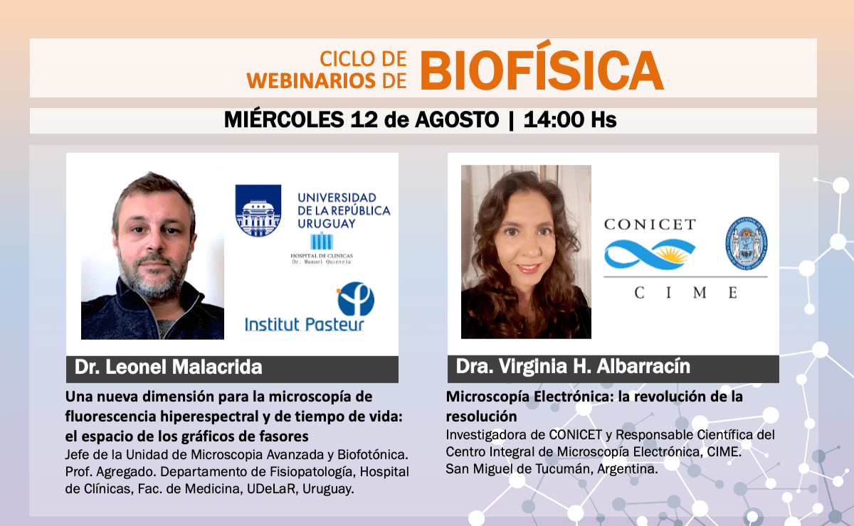 Este es el sexto seminario del Ciclo de Webinarios de Biofísica en español. En esta oportunidad los investigadores invitados son el Dr. Leonel Malacrida, Jefe de la Unidad de Microscopia Avanzada y Biofotónica. Prof. Agregado. Departamento de Fisiopatología, Hospital de Clínicas, Facultad de Medicina, Universidad de la República, Uruguay. Investigador Asociado, Unidad de Bioimagenología Avanzada, Institut Pasteur de Montevideo, Uruguay; y la Dra. Virginia H. Albarracín, Investigadora de CONICET, Responsable Científica del Centro Integral de Microscopía Electrónica, CIME. El seminario estará accesible por YouTube el 12-AGO-2020 desde las 2 pm (Argentina) y será moderado por el Dr. Javier M. González, Investigador de CONICET, director del grupo de Enzimología Estructural del INBIONATEC, Santiago del Estero.