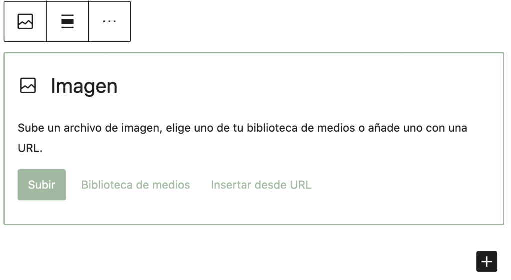 Luego, al hacer click en el signo «+» (esquina superior izquierda) y empezar a escribir la palabra «imagen» donde dice «Buscar un bloque», WordPress nos muestra el área «Multimedia» con varios bloques, incluyendo el bloque «Imagen». Hacemos click ahí, y nos muestra este cuadro de diálogo: