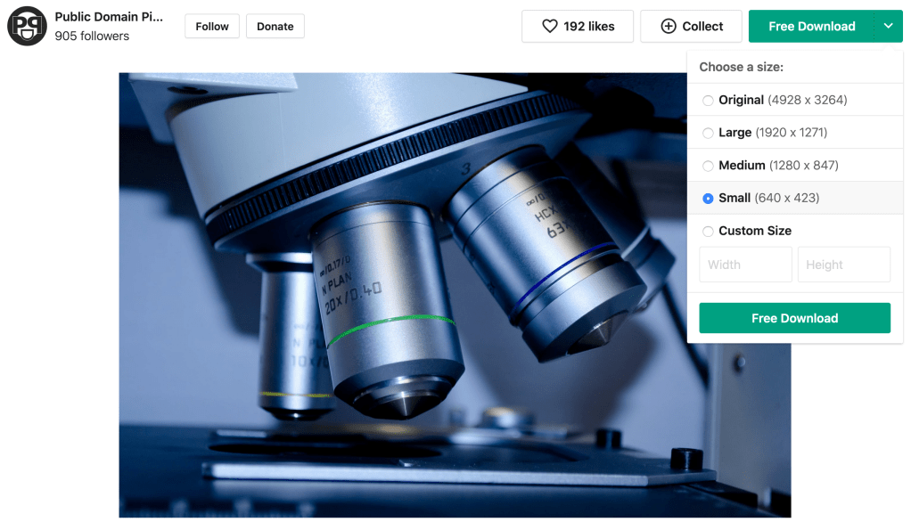 Por ejemplo, si necesito una imagen alusiva sobre un microscopio óptico, busco la palabra «microscope» en Pexels, hasta encontrar la imagen en esta URL: https://www.pexels.com/photo/technology-lens-laboratory-medical-60022/. Para insertarla en el cuerpo del texto, la bajamos a nuestra computadora eligiendo el formato de tamaño más chico («small»):