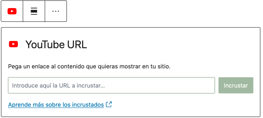 - Análogamente, utilizando el sistema de Bloques que ofrece WordPress.com podemos por ejemplo insertar videos de YouTube desde su respectiva URL. Simplemente buscamos nuestro video en YouTube, copiamos la dirección URL del video (por ejemplo: https://www.youtube.com/watch?v=w4RLfVxTGH4), buscamos el bloque «YouTube» luego de clickear el signo «+», y pegamos la dirección URL del video en el campo para tal fin: