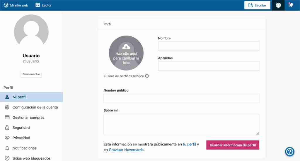 Para crear tu perfil dirígete a este sitio: https://wordpress.com/me. Allí podrás actualizar tu cuenta (asegúrate de usar la misma dirección de email que la asociada a tu invitación de Kognite) incluyendo tu nombre de usuario visible públicamente, una foto para tu perfil, y una breve biografía sobre ti como para que los lectores te conozcan un poco más. La página para crear tu cuenta se ve así: